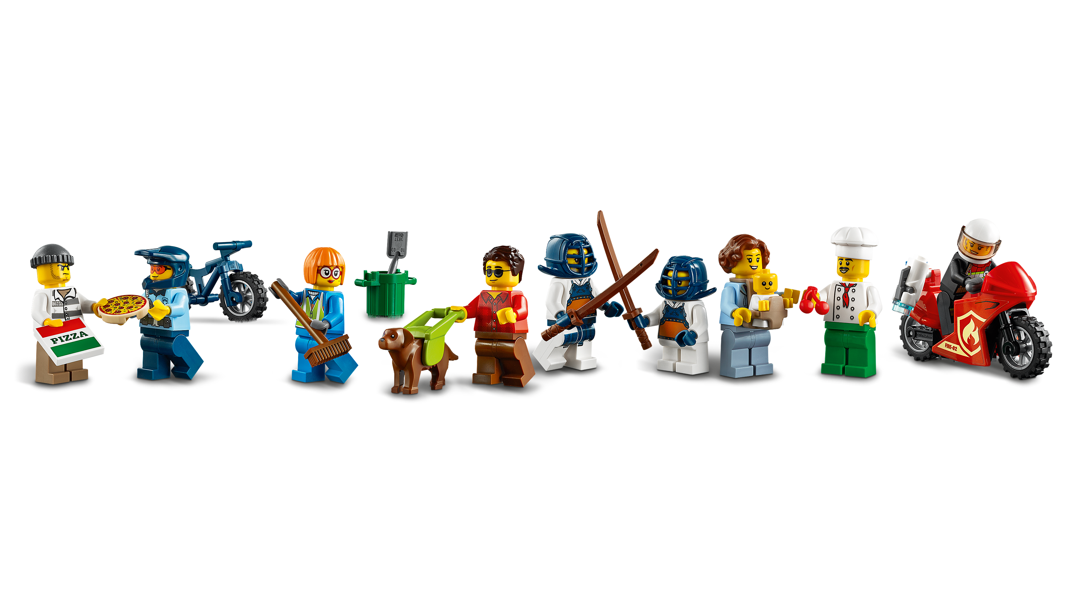 Le minifigure includono anche alcuni nuovi e rari mattoncini come l'imbracatura del cane guida, le maschere da kendo e il marsupio. Crea un cast diversificato di personaggi per popolare i tuoi scaffali ed espositori.