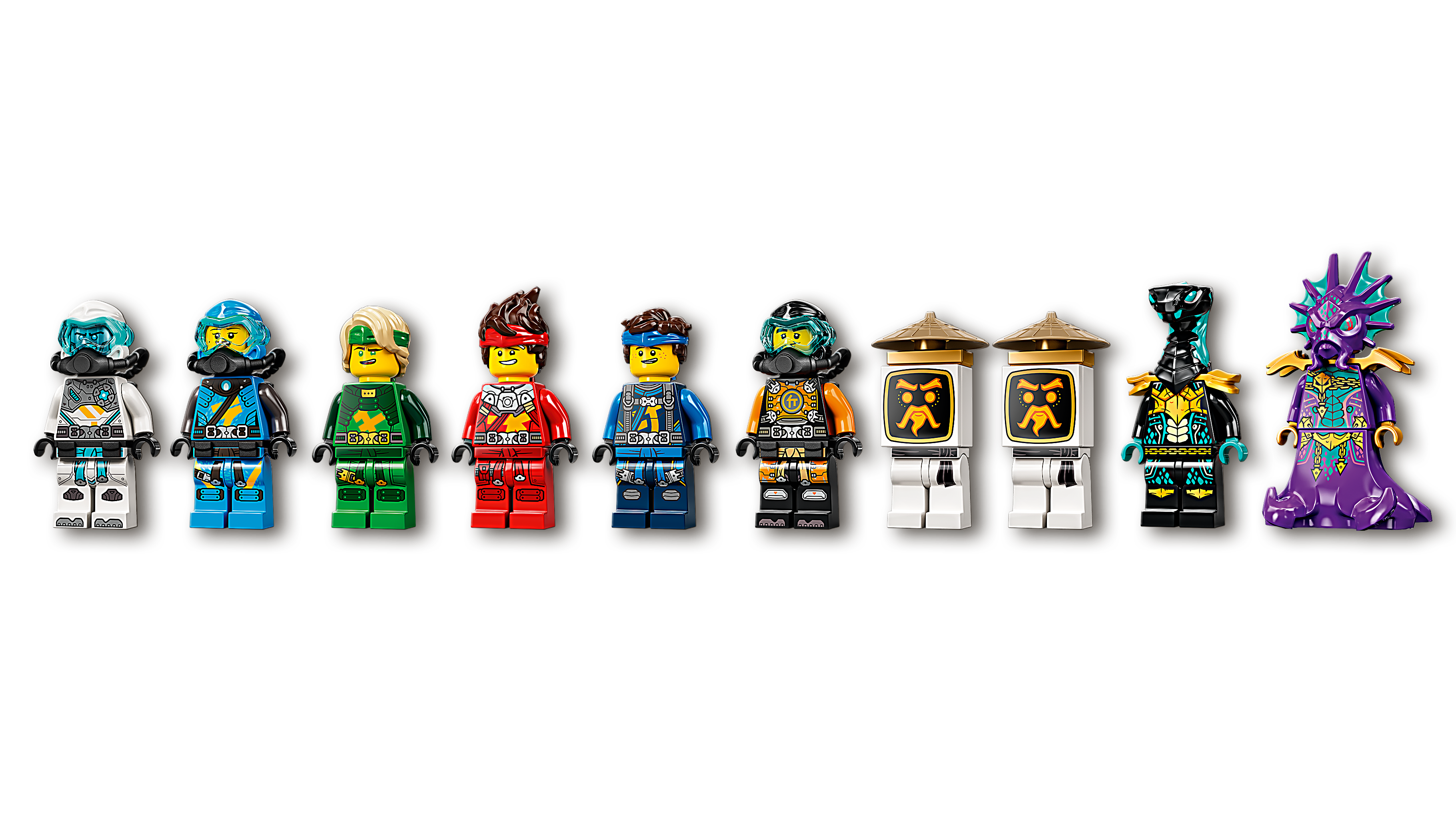 LEGO NINJAGO è noto per le sue interessanti minifigure e non è diverso 71756 Taglia Idro, con l'intera squadra ninja equipaggiata con attrezzatura subacquea esclusiva per la gamma Seabound, due droni, una guardia Maaray e il principe Kalmaar a bordo di un carro trainato da raggi Manta, che appare solo in altri due set.