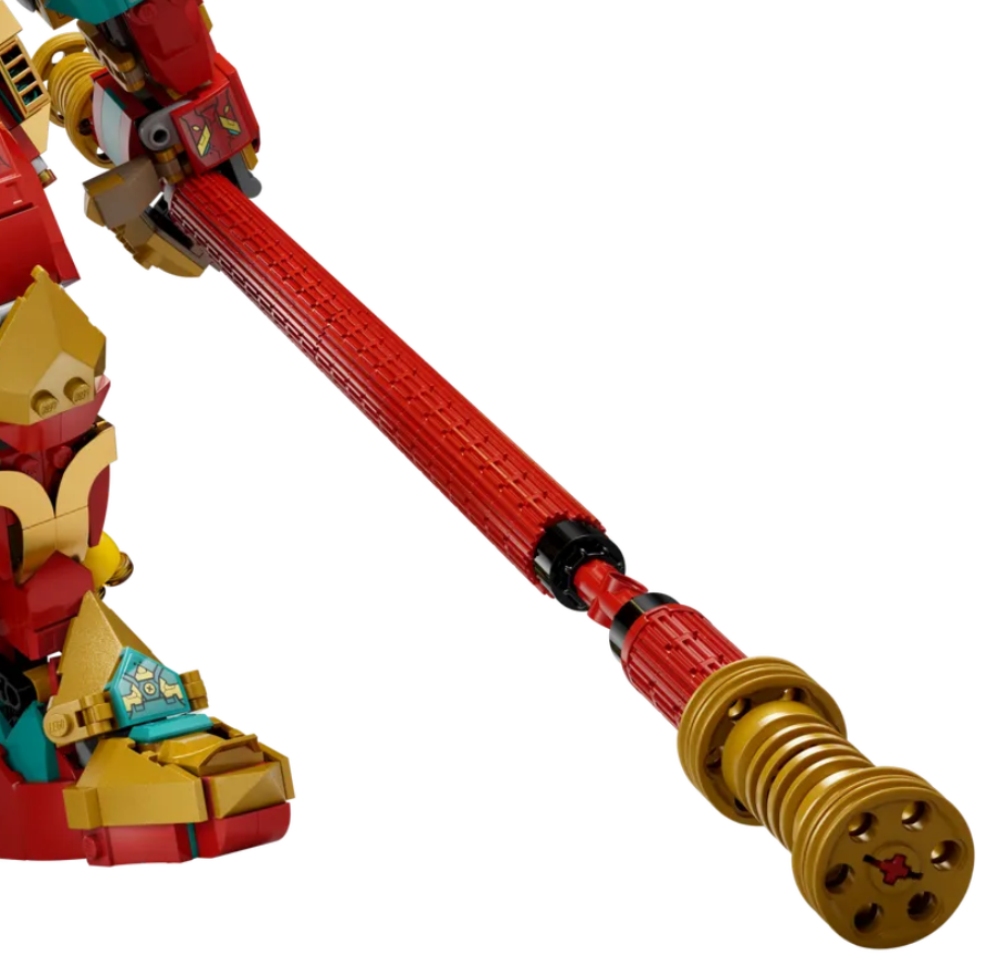 Il personale dentro 80045 Re Scimmia Ultra Mech è più grande rispetto a Monkey King Warrior Mech 80012, con dettagli extra anche sulle punte dell'arma gigante. Sembra anche essere tenuto in un modo diverso, con Technic assi anziché giunti sferici.