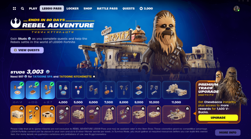 Il LEGO Pass: Rebel Adventure sarà disponibile solo fino al 23 luglio 2024, ma le ricompense gratuite, le ricompense premium e lo stile Chewbacca potrebbero apparire nel negozio di Fortnite in un secondo momento.