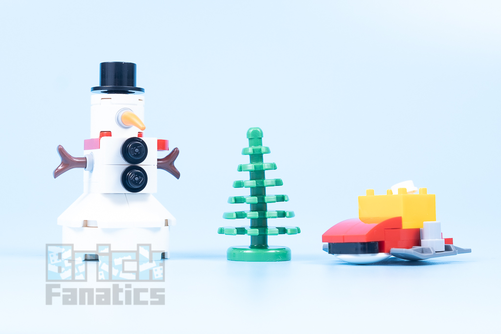 A completare il set c'è un pupazzo di neve, che il LEGO Group tende a lottare con. Questo non è il massimo sforzo, con la sciarpa che sembra un po' goffa e la sensazione di modellatura. Sono inclusi anche un albero e un cane modellati, oltre a un tavolo con tazze e biscotti.