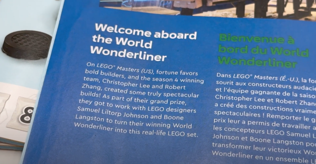 "Quando ci hanno parlato per la prima volta del concept del set, è stato davvero interessante, perché non mi aspettavo assolutamente che andasse in questa particolare direzione", afferma Chris nel video. "Quando abbiamo sentito inizialmente che il nostro set si sarebbe basato [sul] World Wonderliner, mi aspettavo qualcosa di simile al set più grande del Boeing che avevamo ricevuto all'epoca, o forse qualcosa come il Concorde in termini di aereo gigantesco.
