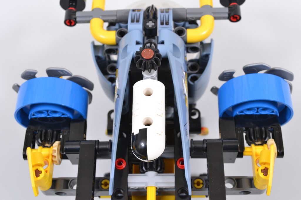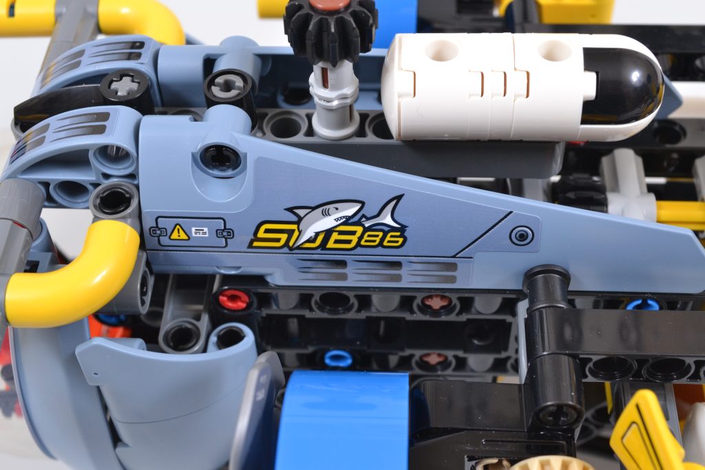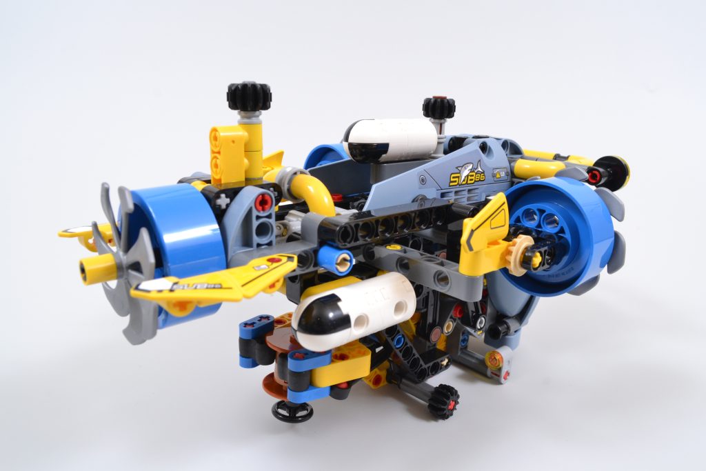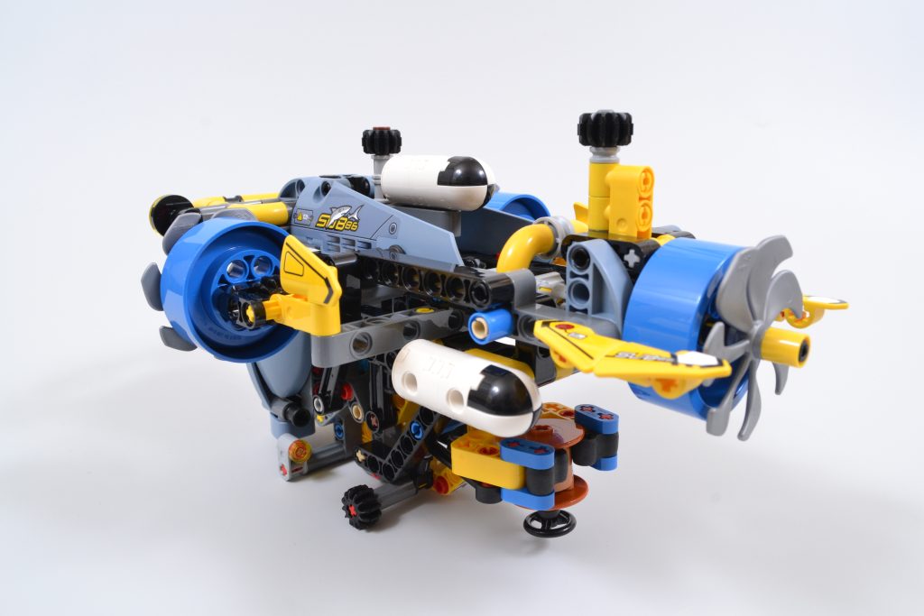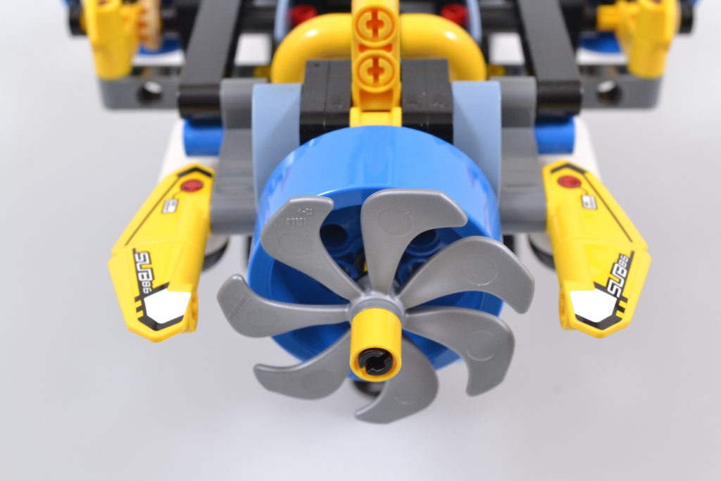 Il set LEGO Technic include tre funzioni principali, tutte attivabili ruotando vari ingranaggi neri. Queste funzioni consentono di angolare e ruotare le tre eliche in sincronia, di ripiegare il braccio estensibile all'interno del sommergibile e di agganciare con gli artigli un accessorio in mattoncini o altri piccoli oggetti.