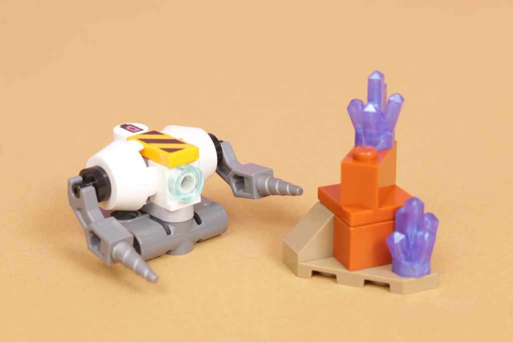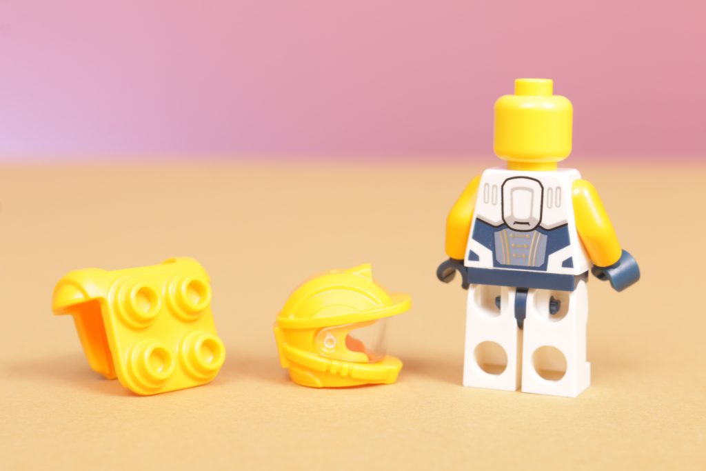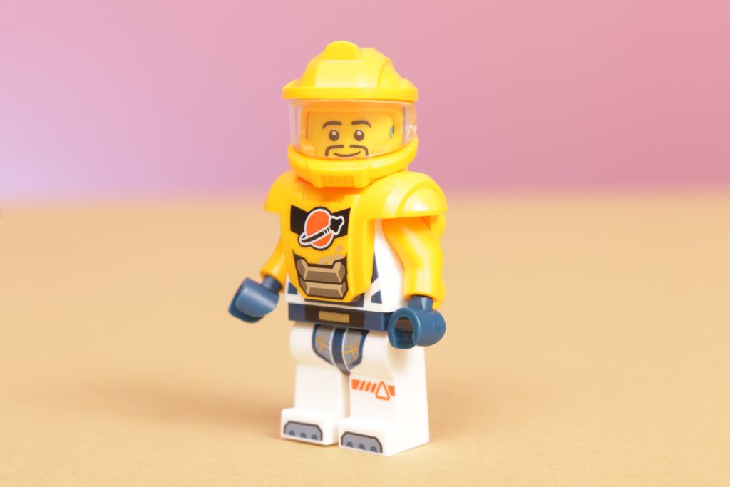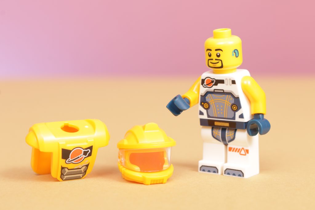 LEGO City 60428 Meccanismo di costruzione spaziale viene fornito con l'unica minifigure, vestita con una tuta spaziale arancione chiaro che assomiglia più da vicino a un minatore spaziale di qualche tipo, completa di visiera capovolta. È un design che si adatta perfettamente al tema generale del set, mentre anche la minifigure si adatta perfettamente al mech per azionarlo. Inoltre c'è anche un piccolo robot perforatore compagno, che sembra un secondo personaggio senza la spesa di uno.