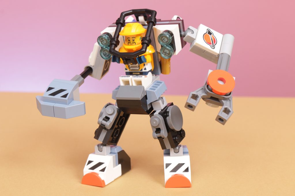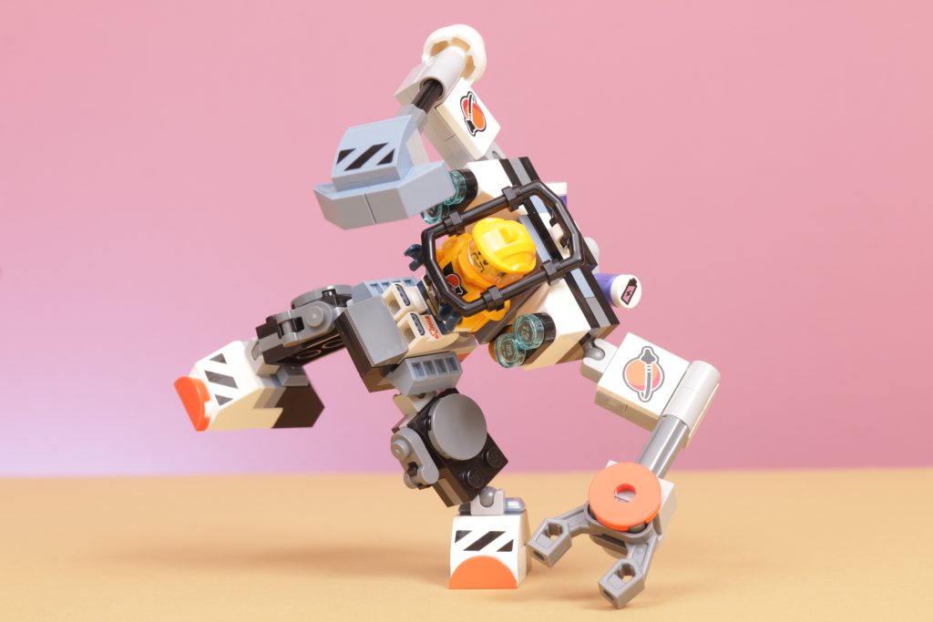 LEGO City 60428 Meccanismo di costruzione spaziale è descritto come un "futuristico mech giocattolo [che] è dotato di bracci con martello e artiglio, una cabina di pilotaggio per minifigure e grandi piedi per esplorare pianeti lontani", e sicuramente soddisfa questi punti, con gli strumenti su entrambe le braccia che sono prominenti in il suo design.