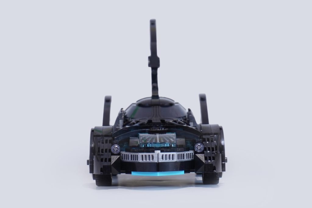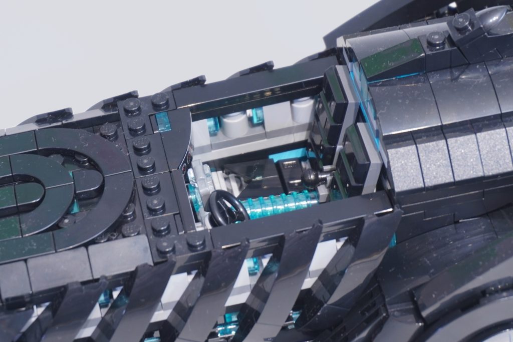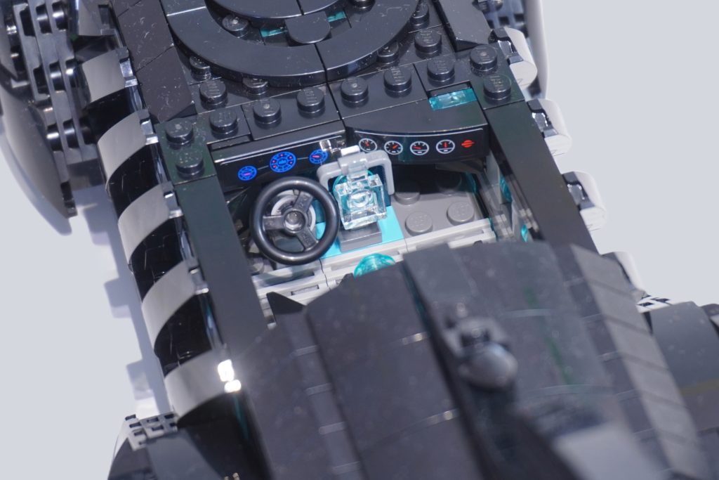 Qui si è cercato di replicare quella luminosità, principalmente attraverso l'uso di mattoncini blu trasparenti. Il problema è che, sebbene questi pezzi siano bellissimi da soli, si perdono un po' di visibilità quando sono circondati dal nero opprimente del resto della costruzione. La capacità dei mattoncini LEGO neri di assorbire la luce sarà un problema familiare per i LEGO. Batman fan, ma in un caso in cui, per una volta, il LEGO Group ha regalato ai fan una Batmobile che dovrebbe letteralmente brillare, è un peccato che questi mattoncini trasparenti siano così potenti da risultare appena visibili.