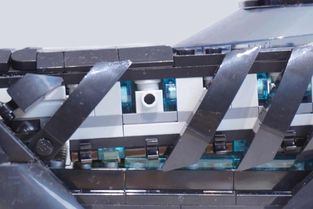 I lati del modello presentano una fila di punte, larghe un singolo perno, che sporgono dalla carrozzeria. Se orientate correttamente, queste punte hanno un bell'aspetto, ma se le si sfiora accidentalmente, ruoteranno, in alcuni casi spingendosi a vicenda come una pila di tessere del domino. Ci sono molti pezzi diversi all'esterno del set che possono facilmente cadere, e quindi questo è probabilmente un set che funzionerà molto meglio come pezzo da esposizione che come giocattolo, semplicemente perché sembra che la minima brezza potrebbe finire per spostare alcuni dettagli.