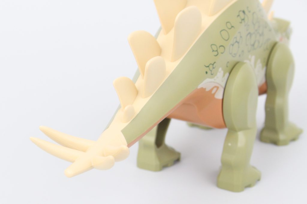 Questi aspetti iconici del dinosauro non sono stampati o decorati in alcun modo, poiché sono realizzati con elementi in gomma rigida. Purtroppo non sono abbastanza rigidi, poiché una delle spine si è deformata nella nostra scatola ed è piegata in modo permanente, anche se solo leggermente. A condizione che questo problema possa essere risolto nelle iterazioni successive, lo Stegosauro LEGO potrebbe avere un futuro brillante davanti a sé, ma allo stato attuale, c'è ampio margine di miglioramento.
