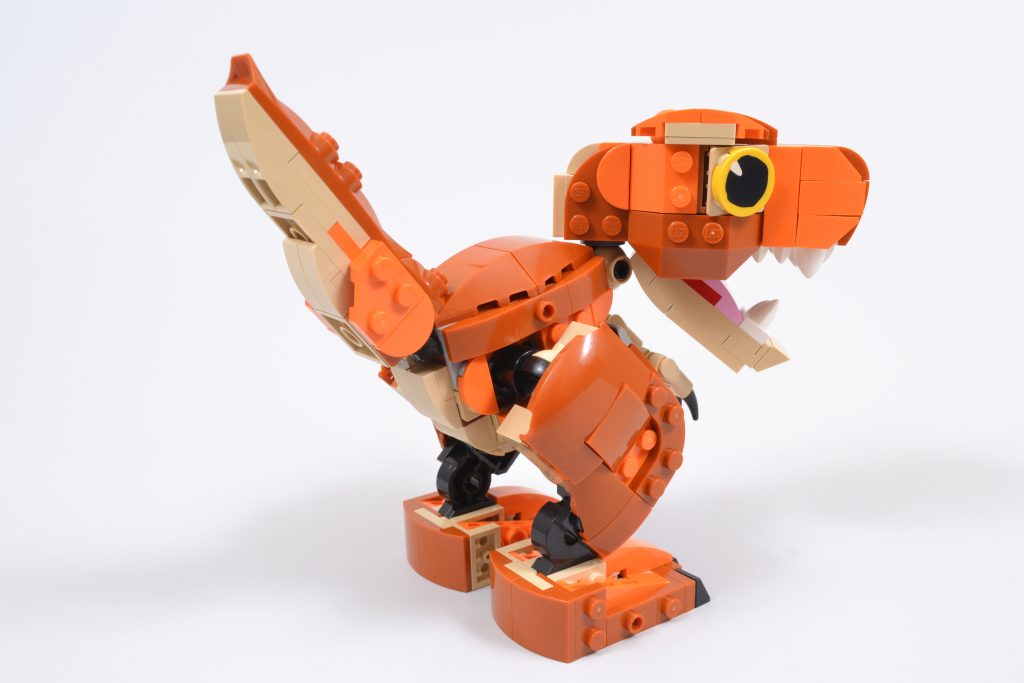 Il LEGO Jurassic World il modello è abbastanza robusto, essendo costruito principalmente da una selezione di elementi arancione scuro, arancione normale e marrone scuro, con due gambe solide e piedi artigliati che forniscono stabilità. Gli arti inferiori di Little Eatie possono essere mossi avanti e indietro, ma lei si alzerà in piedi solo in una posa specifica.