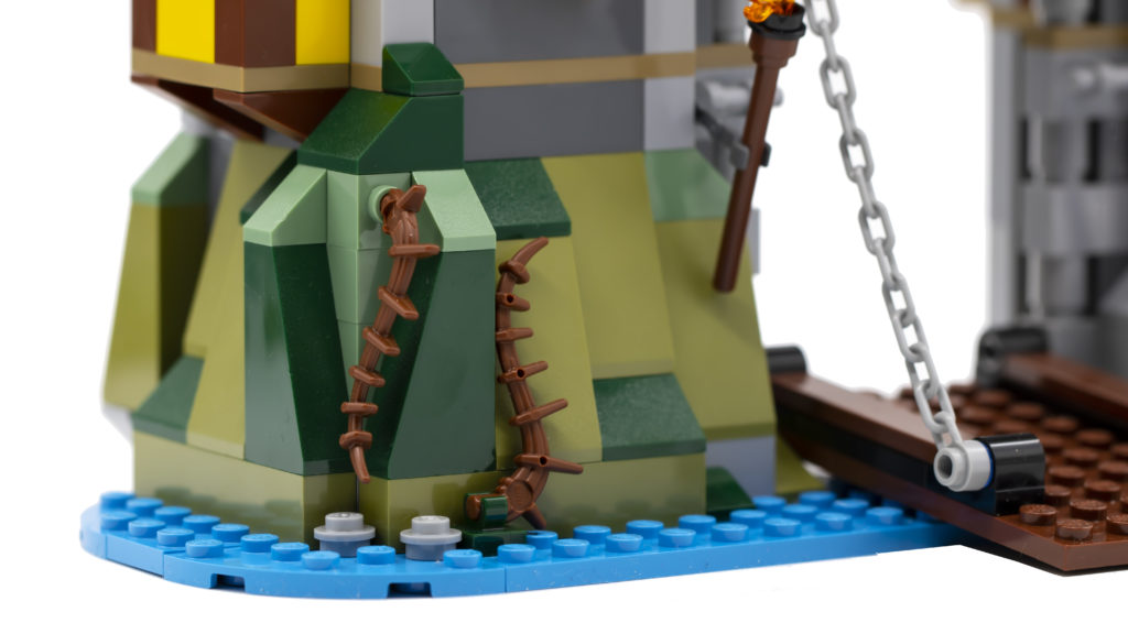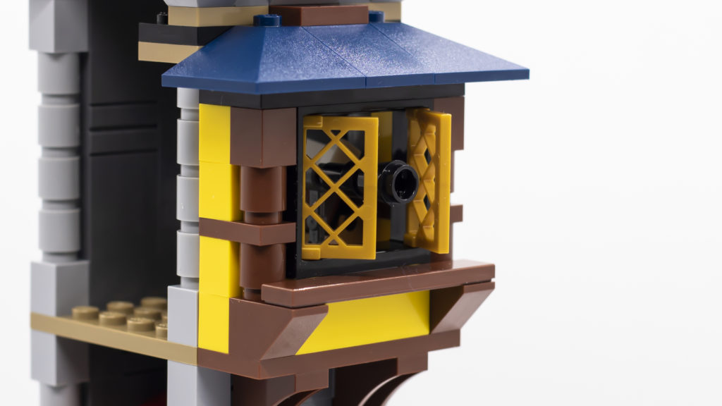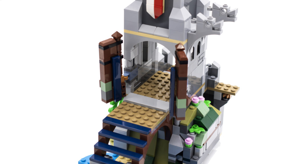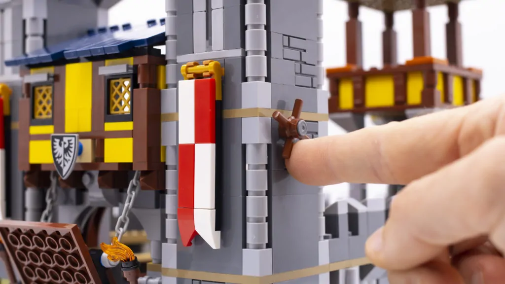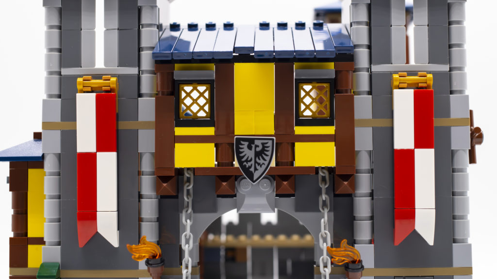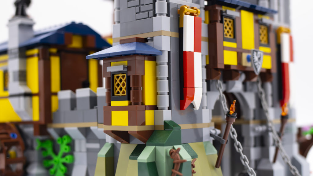 I lati del castello, le finestre, i merli, il ponte levatoio e le torri sono stati tutti notevolmente migliorati grazie a nuove tecniche e componenti. I castelli di una volta avrebbero utilizzato un singolo pezzo di muro con uno spazio modellato per la feritoia, ma qui lo stesso design è ottenuto utilizzando un certo numero di mattoni, con la feritoia costruita da piastrelle 1×2 inclinate verso l'interno. Non è solo un design intelligente, ma sembra anche incredibilmente accurato.