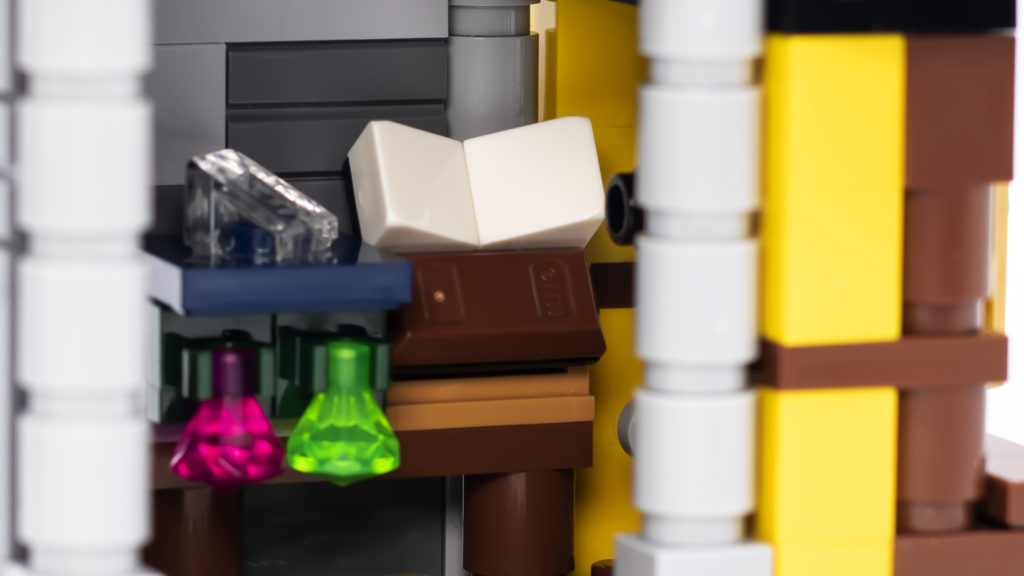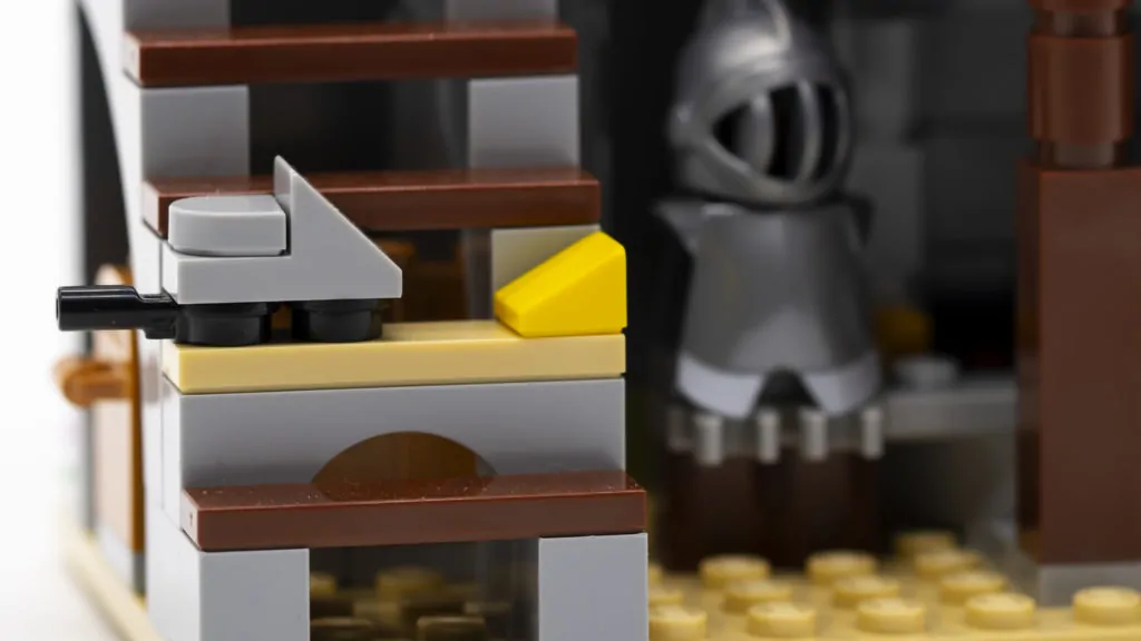 Le sezioni interne sono dove il set inizia davvero a dare l'impressione di essere stato progettato nell'era moderna. Le varie stanze in sé non sono così grandi, ma sono comunque piene di dettagli. Una sedia in mattoni molto decente può essere trovata sopra l'officina del fabbro, e sotto nell'officina stessa ci sono il martello e l'incudine, un camino, un'armatura in mostra e persino uno scrigno del tesoro nascosto.