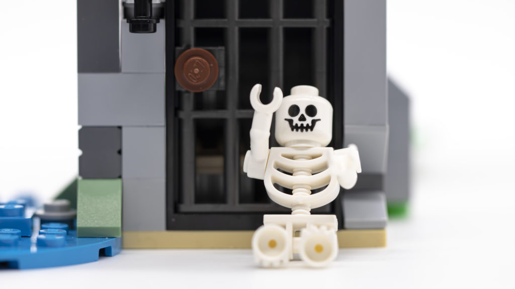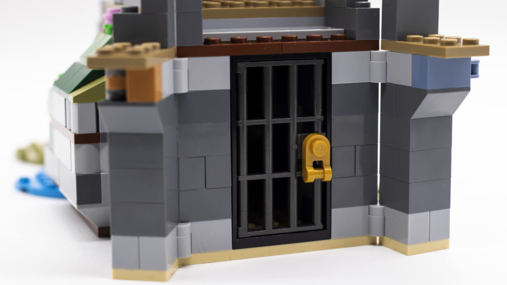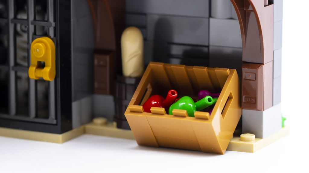 L'altro lato del castello comprende un piccolo mercato, una prigione e una torre di legno. Molto suggestivo è il mercatino con una tenda rossa e rosso scuro (realizzata con pendii curvi 1×4), mentre il dungeon ospita uno scheletro e ha una parete staccabile per l'accesso. Ancora una volta, la torre sembra incredibilmente autentica e cattura con successo l'aspetto di un periodo medievale.
