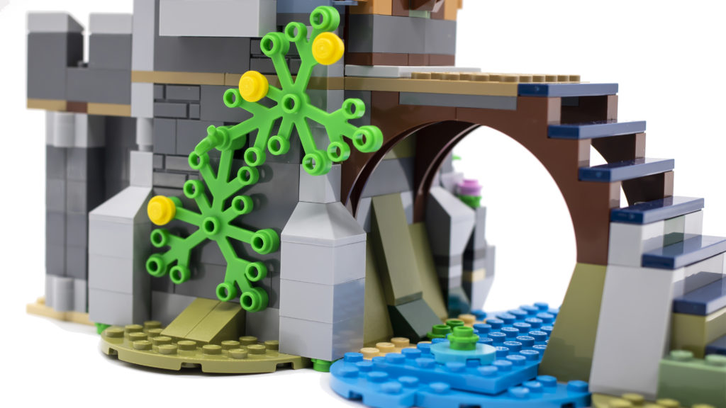 I designer hanno mescolato la tavolozza dei colori e si sono allontanati da un castello che è prevalentemente di una singola tonalità di grigio, il che crea molto più interesse e autenticità. Il modo in cui i verdi scuri e color sabbia sono mescolati tra gli strati inferiori del castello è eccellente, creando un senso di muschio e alghe che crescono sui lati. Migliora davvero l'aspetto del castello finito ed è un aggiornamento molto gradito. Funghi costruiti in mattoni e un piccolo albero aiutano ad aggiungere ancora più dettagli.