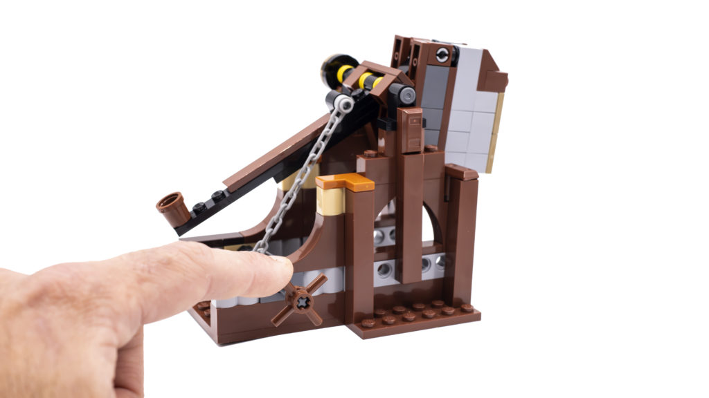 Questo è quindi collegato a a Technic asse con quattro barre che si trova sul lato del muro. Ruotando l'asse si alza e si abbassa il ponte levatoio. È una piccola caratteristica di gioco che rappresenta ancora una volta un aggiornamento significativo sui castelli del passato, che usavano lo spago ed erano piuttosto complicati da usare e costruire.