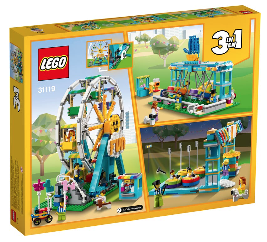 31119 Ruota panoramica è ricco di dettagli extra come una biglietteria, un carrello per palloncini, una macchina per artigli, una macchina per gomme da masticare e un cane in mattoncini. Inoltre, il set include anche cinque minifigure a forma di mamma, papà, bambino e due addetti alla fiera, che possono essere posizionate dentro e intorno alle attrazioni.