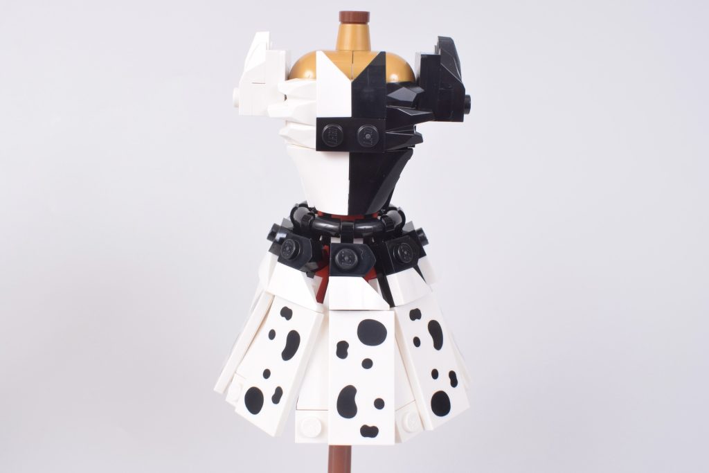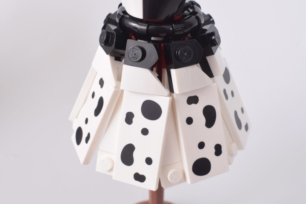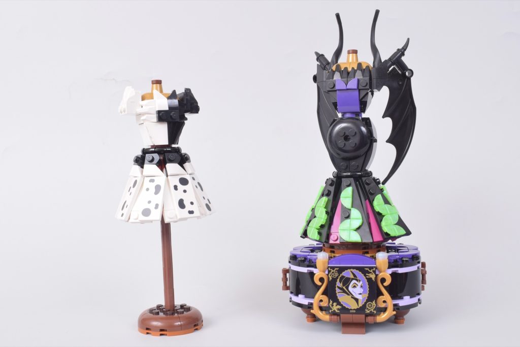 Rispetto al suo set di riflessi eroici, 43266 L'abito di Cenerentola, le tecniche di costruzione creative, i colori contrastanti e le sagome sorprendenti in 43262 Abiti di Malefica e Crudelia De Mon sono molto più accattivanti. Entrambi si adattano perfettamente allo stile dei rispettivi cattivi e puoi scegliere di mettere il tuo preferito su una base espositiva in mattoncini (il cui modello può essere personalizzato con elementi extra inclusi nel set).