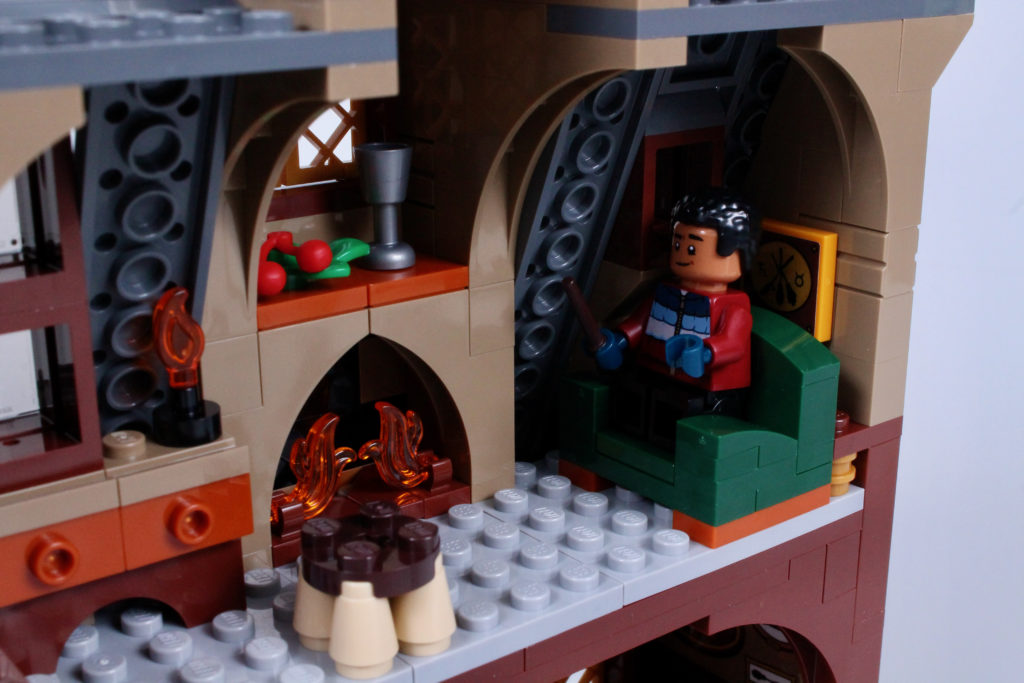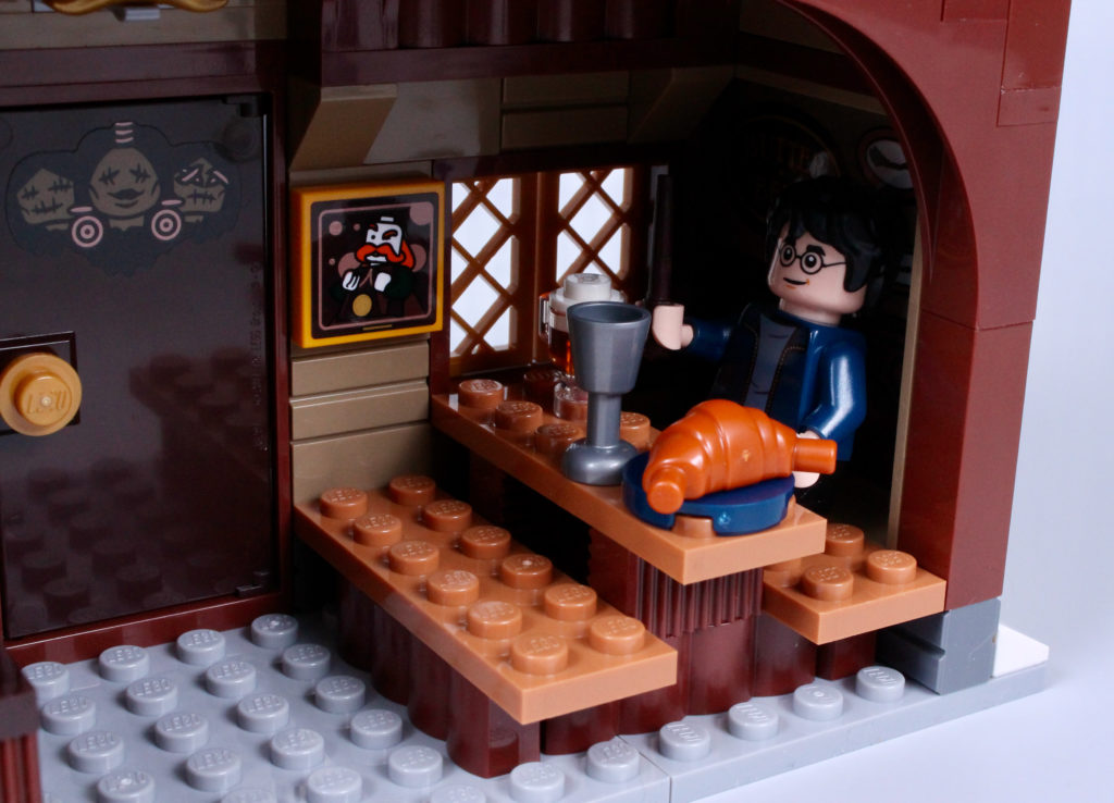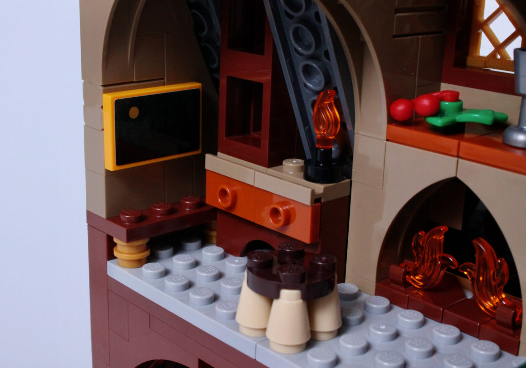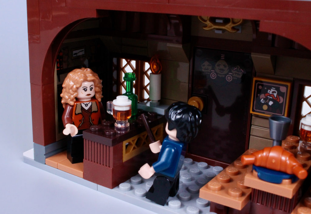 Lo stesso vale per il pub, che fa ampio uso di caminetti e candele per evocare l'atmosfera accogliente che un pub tradizionale potrebbe offrire in una nevosa giornata invernale. Questi interni a due piani sono il vero punto forte del 76388 Hogsmeade Village Visit, e senza dubbio la parte più interessante dell'edificio, altrimenti deludentemente semplice.