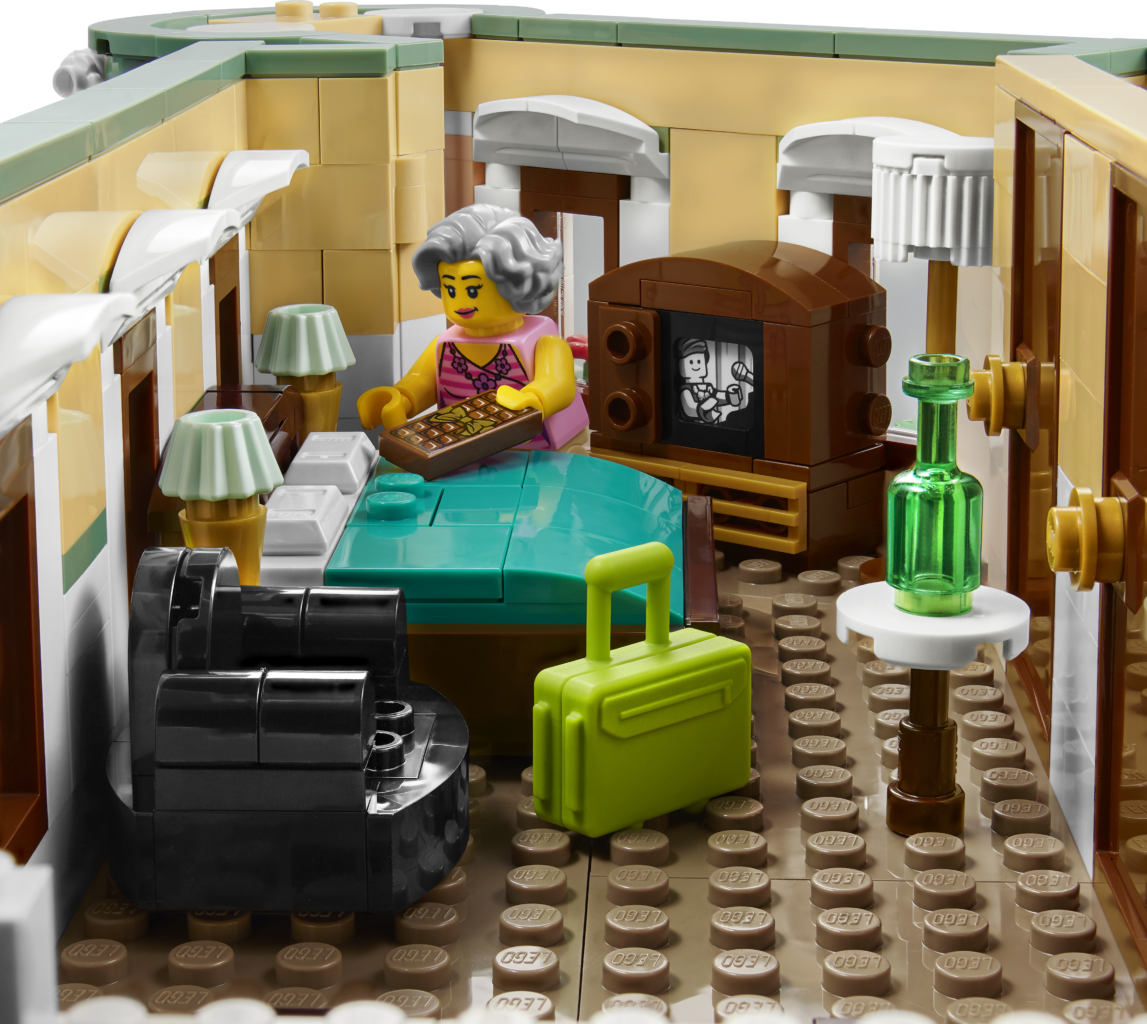 Fuori dall'hotel c'è un piccolo bar, completo di due tavolini e una palma riccamente dettagliata. La galleria adiacente è piccola, ma piena di opere d'arte, tra cui una scultura del LEGO Creator Expert logo. Questo marchio è stato utilizzato per le versioni precedenti della linea Modular Buildings, rendendolo un ottimo easter egg per LEGO ventilatori. C'è anche un piccolo carrello del caffè per svegliare gli ospiti la mattina.