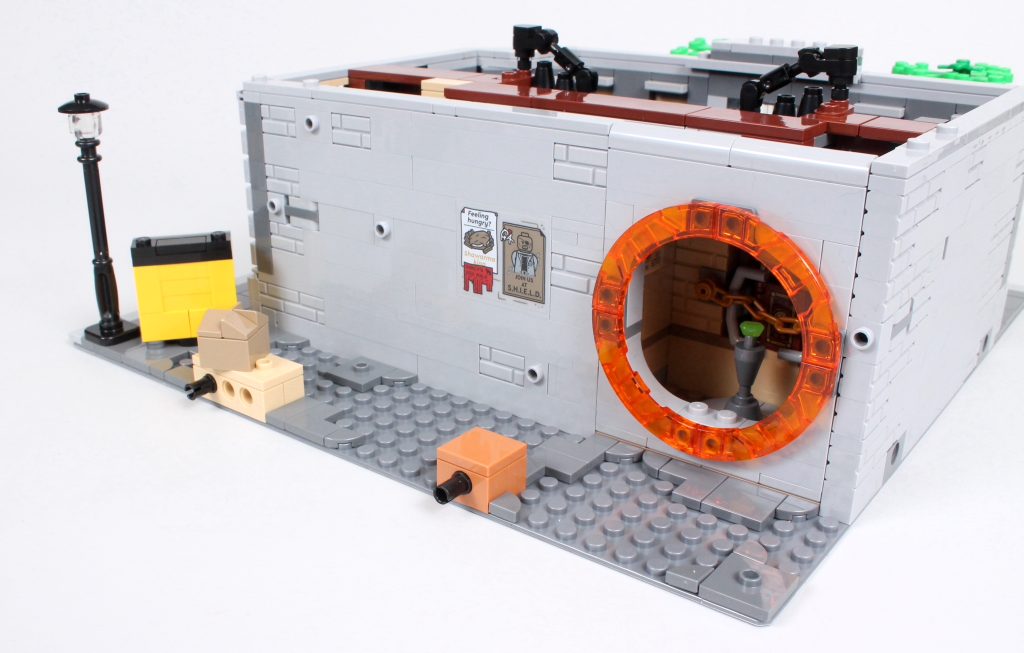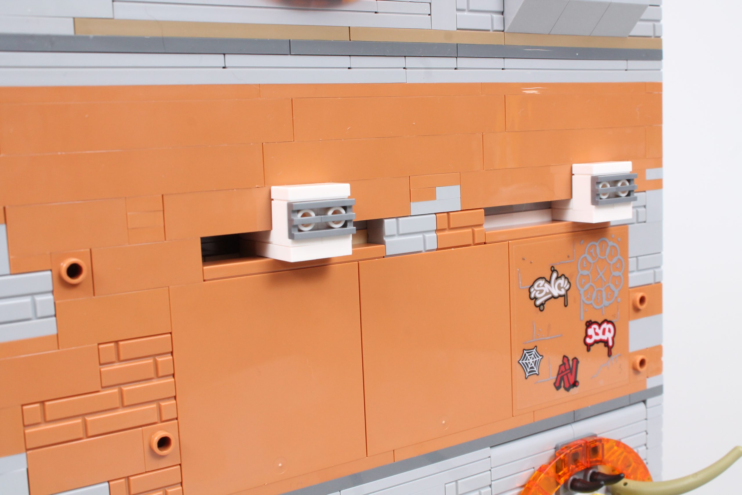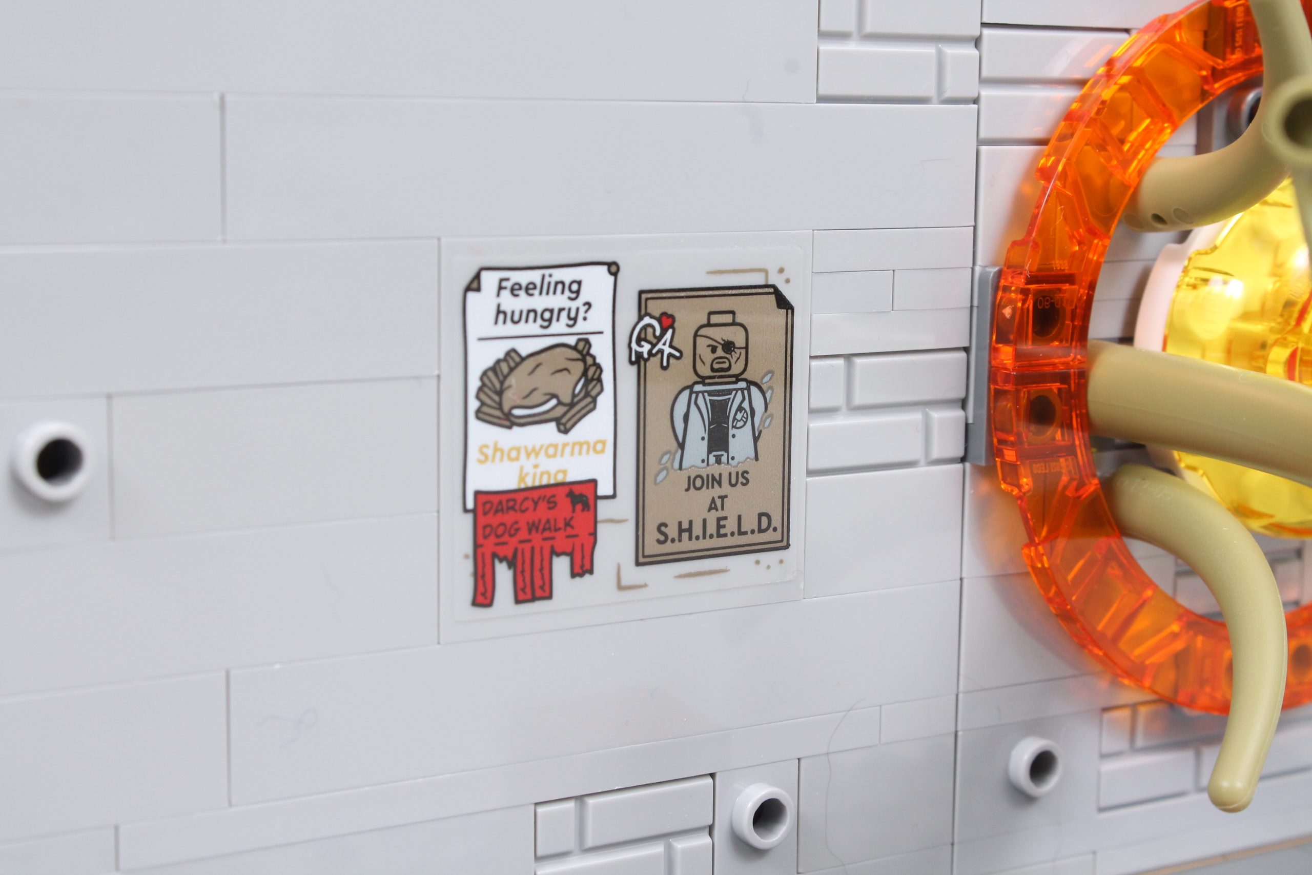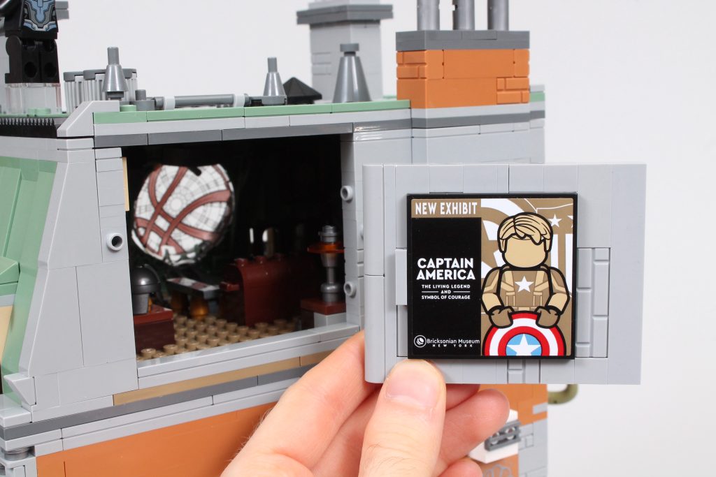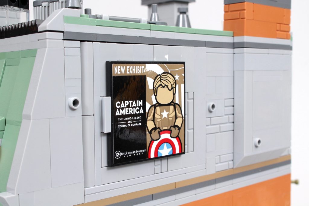 La seconda funzionalità interattiva offre la possibilità di personalizzare il Sanctorum. Man mano che si procede con la costruzione, si creeranno tre ampi e ben visibili buchi nelle pareti di ciascun piano, che verranno poi riempiti con l'ultimo sacchetto di mattoncini. Questi si uniscono per creare tre pannelli separati: uno con un portale che le nostre minifigure possono attraversare; uno con un cartellone pubblicitario per una mostra di Capitan America al Bricksonian Museum (divertente!); e uno che mostra Gargantos (del set 76205 Gargantos Showdown di quest'anno) che sbircia attraverso un altro portale.