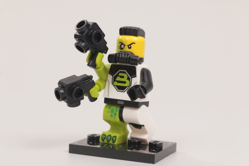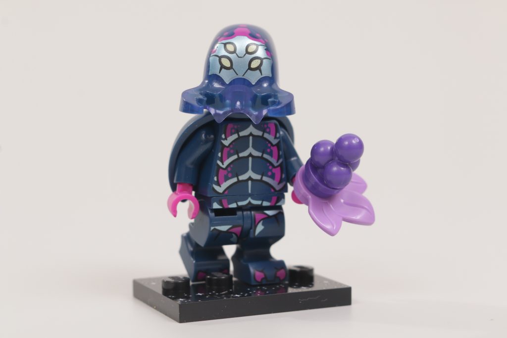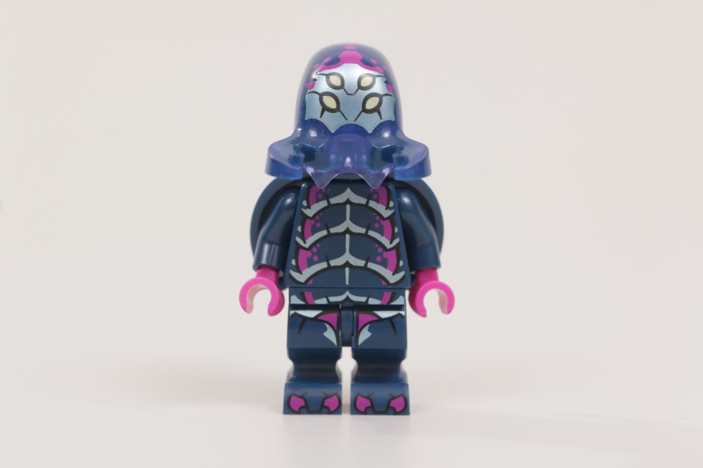 Sebbene l'imitazione del design alieno precedente evochi nostalgia e offra questo personaggio come un'aggiunta rilevante alla collezione di qualsiasi fan LEGO di una certa età, la scelta dei colori è ciò che funziona davvero meglio qui, grazie alla stampa magenta e azzurro metallizzato che contrasta efficacemente con il blu scuro di base. Questo è ulteriormente esaltato dal fatto che la testa, realizzata in un unico pezzo, è stampata in viola trasparente per un ulteriore effetto insetto. Il team Minifigures avrebbe potuto mantenerla blu scuro, ma è la prova che i piccoli dettagli hanno fatto un ulteriore passo avanti e hanno davvero rifinito ogni personaggio della Serie 26.
