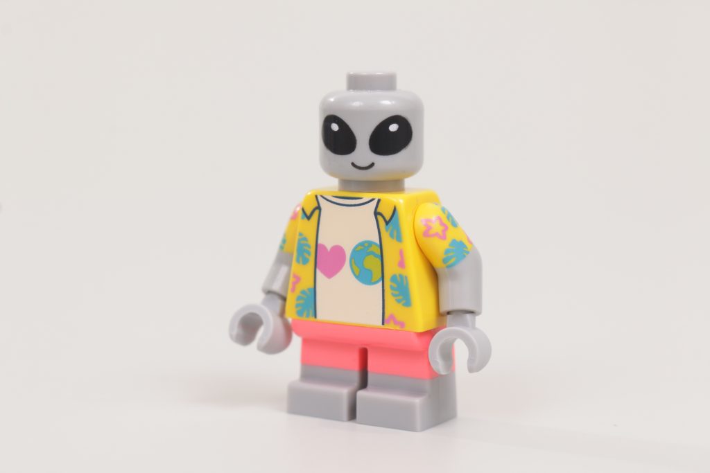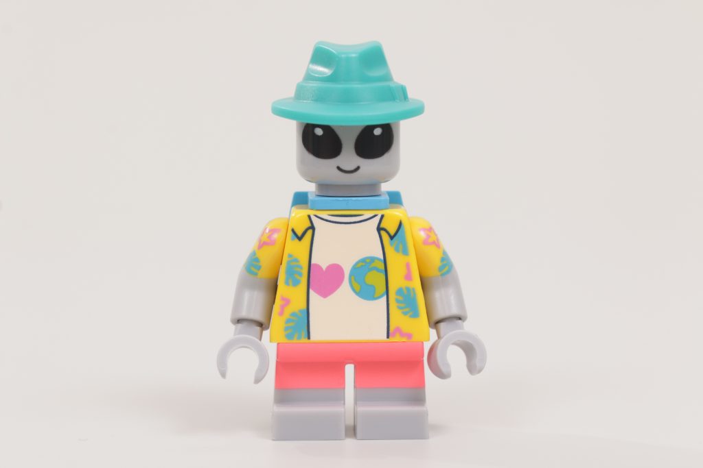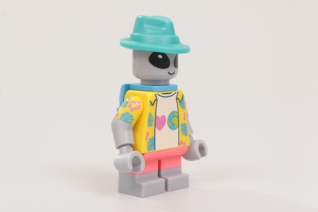 Incanalando Roger Smith di American Dad arriva il Turista Alieno, un ragazzino felice che è appena uscito per fare un po' di giro turistico intergalattico. Sta dondolando la testa di una minifigure standard in grigio con grandi occhi neri, un design che sembra un richiamo alla Serie 6 Classic Alieno, ma sono la graziosa maglietta hawaiana e i pantaloncini che fanno davvero vendere questa minifigure.