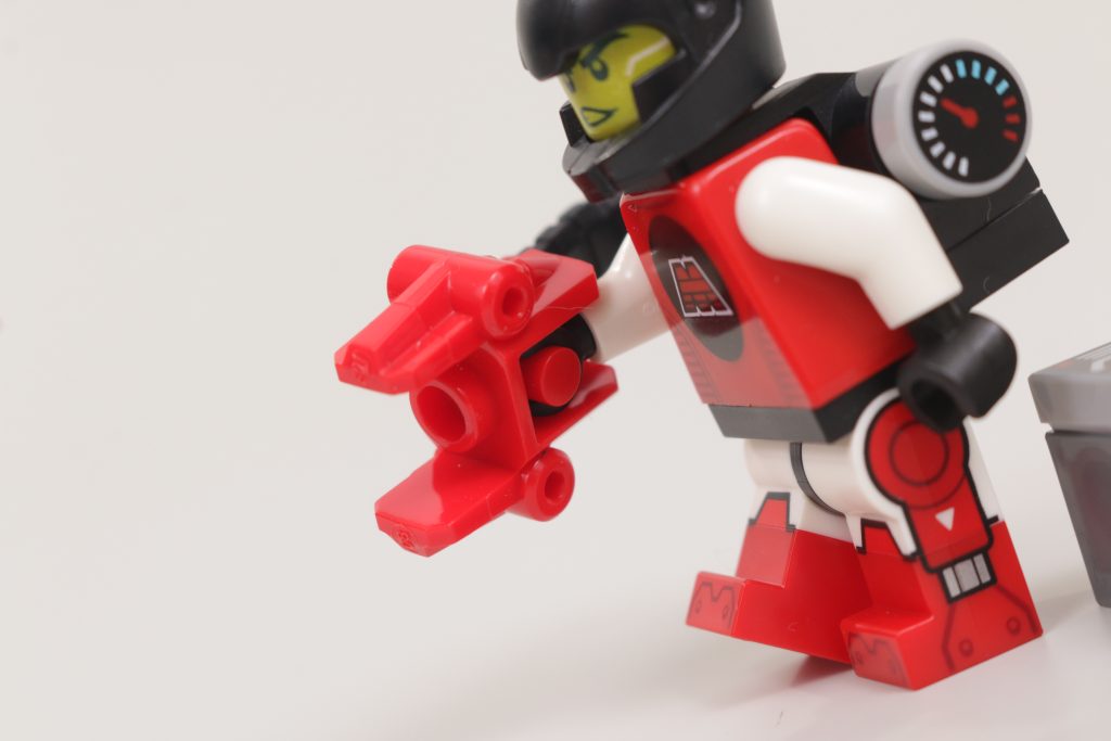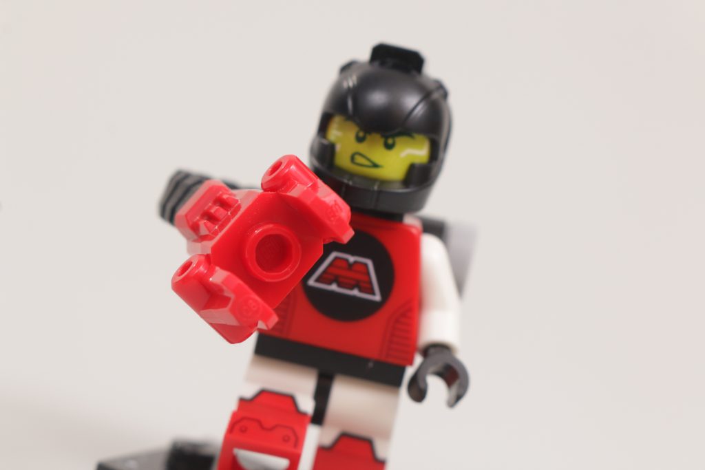 Nel caso di M-Tron Powerlifter, ciò avviene tramite una tuta dettagliata che, come abilmente dimostrato da questo astronauta, consente a chi lo indossa di sollevare oggetti più pesanti grazie ad una mano che afferra. Si tratta di una mano di plastica con una catena in stile gomma collegata insieme per formare un unico pezzo: sta bene nella mano della minifigure, con il perno nella mano in grado di afferrare saldamente un mattoncino, ed è comunque flessibile per varie pose e movimenti del braccio .