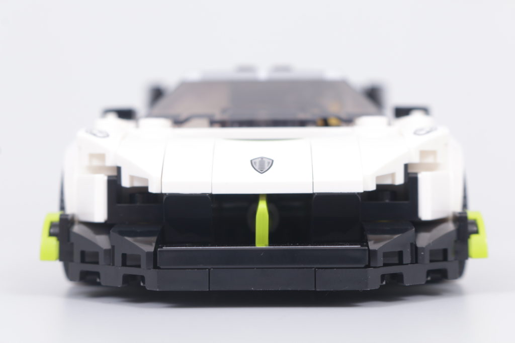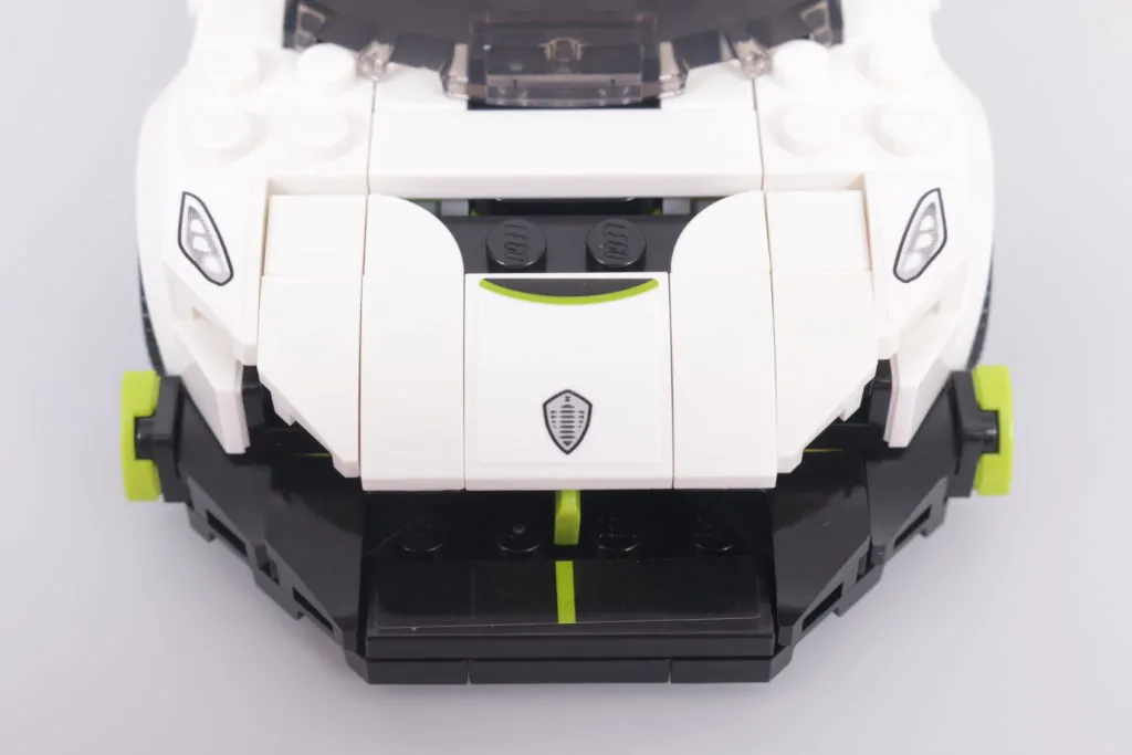 Si trovano principalmente alle estremità del modello LEGO, dove la Koenigsegg Jesko 76900 brilla davvero di autenticità – in effetti, è anche lì che la grafica della scatola si concentra maggiormente, e per una buona ragione. Il frontale del veicolo si abbassa in modo evidente sopra un sorprendente splitter anteriore, sapientemente realizzato in LEGO grazie all'uso di un pezzo di cleaver verde lime. È una soluzione di design inaspettata, ma fondamentale per allineare il modello LEGO il più possibile al materiale originale, essendo un'area dell'auto che quasi sempre attira l'attenzione per prima.