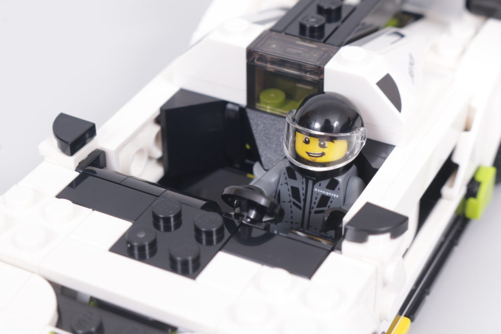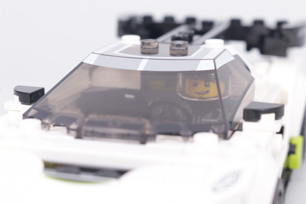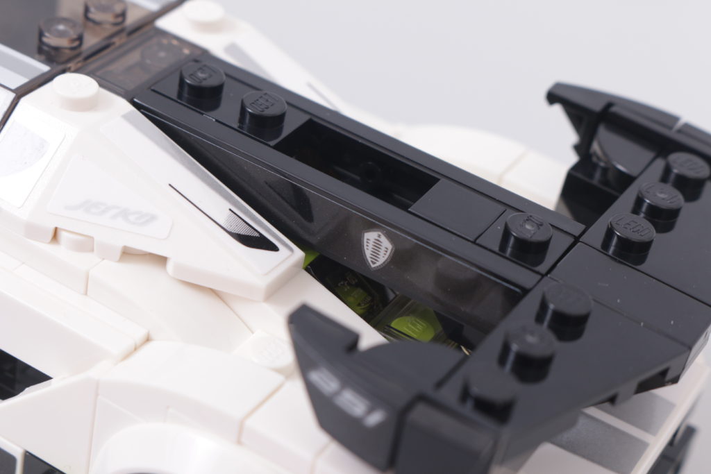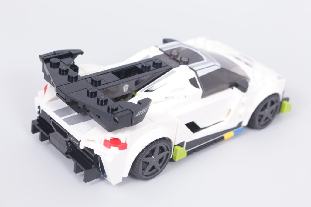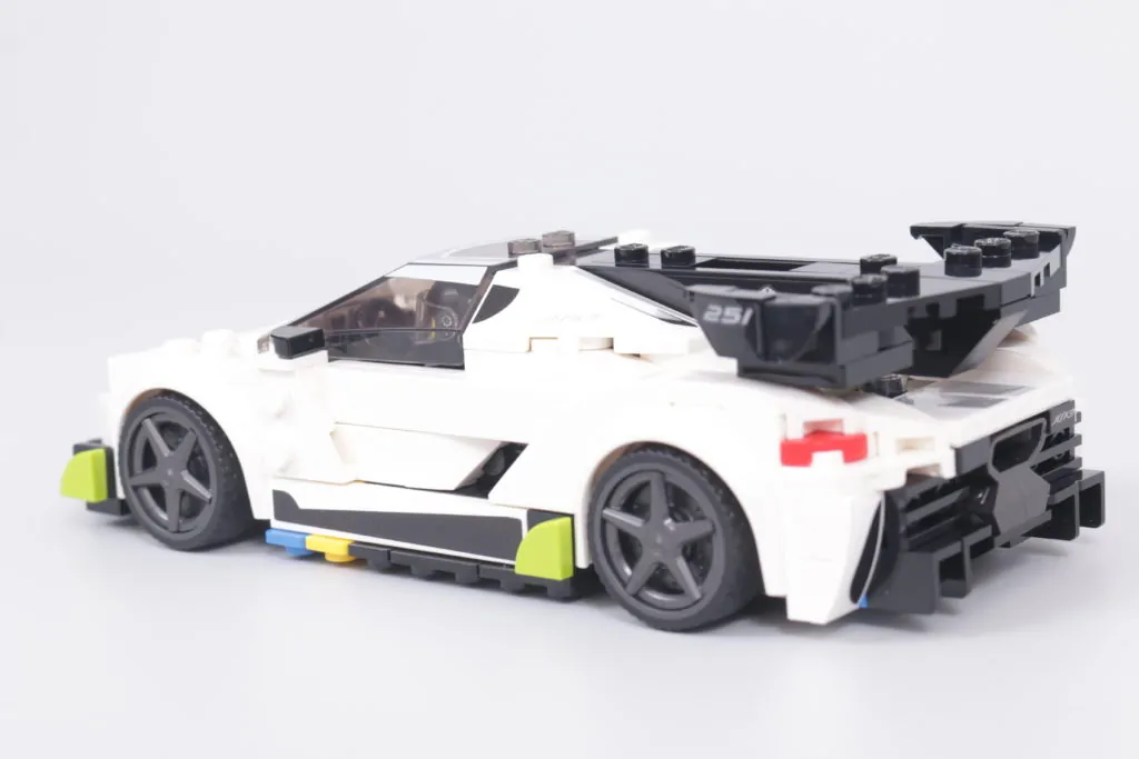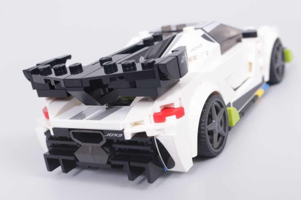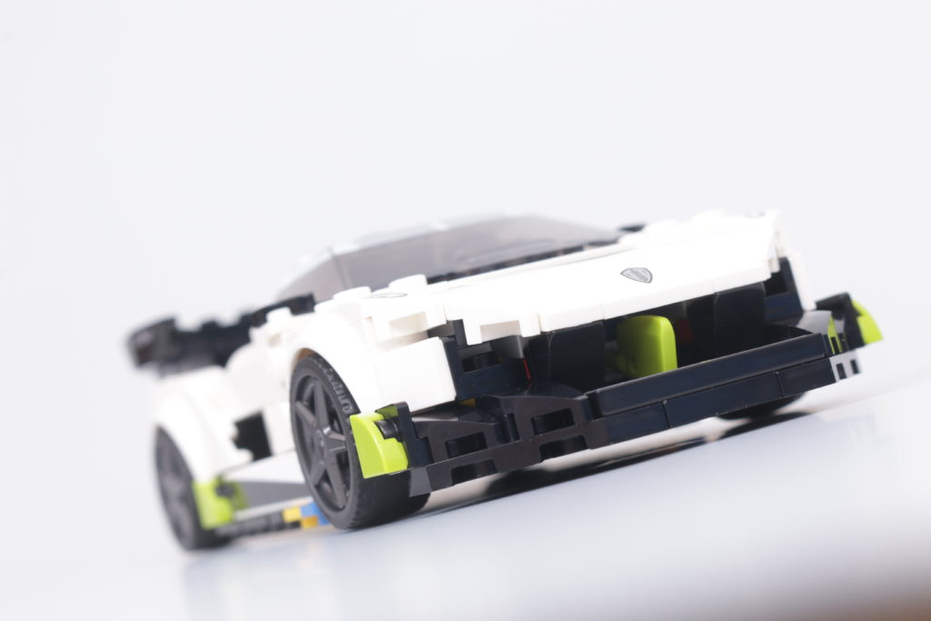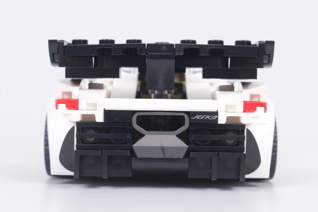 Questo accade quasi sempre, perché il resto del tempo sarà incentrato sull'enorme alettone posteriore che sporge dal tettuccio centrale sul retro, con alette dalla forma particolare su ciascuna estremità. Per quanto riguarda la legalità della costruzione LEGO, la versione in mattoncini fa fatica a replicare lo stesso livello di delicatezza dell'auto reale, ma la forma è per il resto abilmente ricreata e in sintonia con il resto del modello, in particolare per quanto riguarda una ricostruzione senza sforzo – e altamente accurata – della parte posteriore del veicolo. Lo scarico centrale, ricavato da un pezzo di motore, è un punto culminante degno di nota.