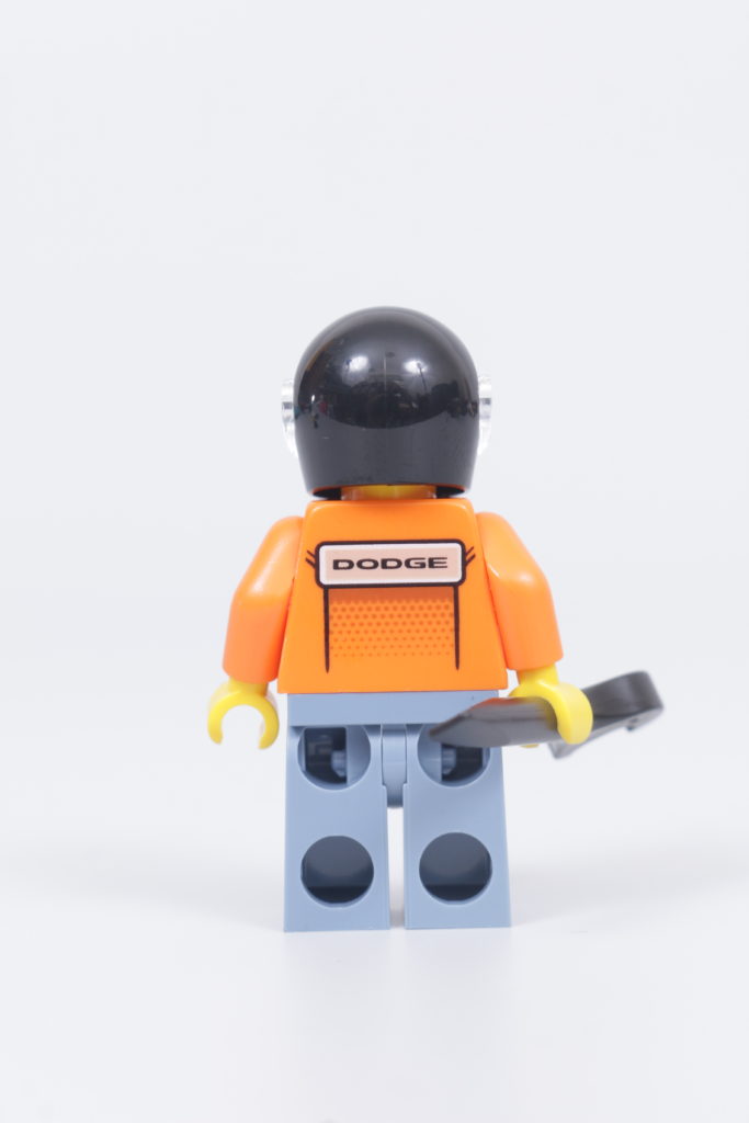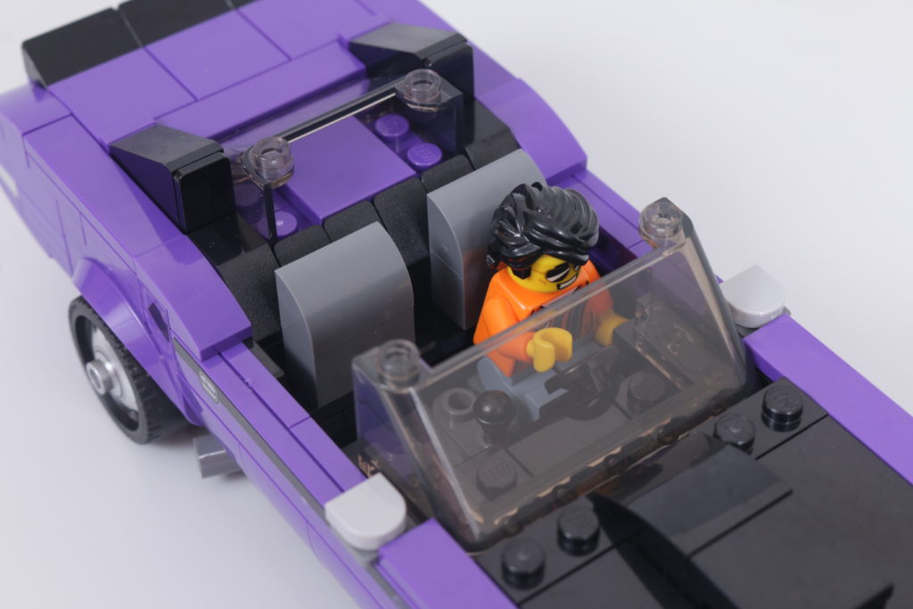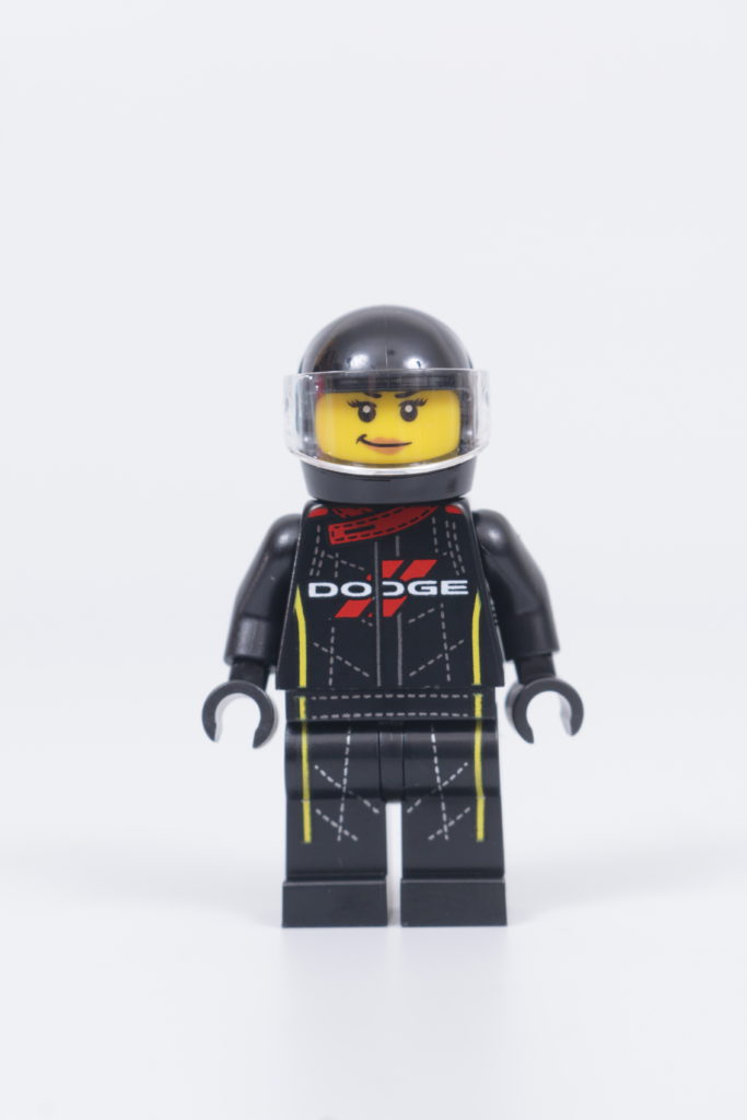 È inclusa una minifigure per ogni veicolo, con il drag racer che beneficia del design più completo specifico per il set nella tuta da corsa. Detto questo, il busto della giacca arancione per il pilota Challenger è altrettanto esclusivo ed è il vero uovo di Pasqua incluso nel set, basato sul design originale della giacca Dodge Scat Pack Club dell'epoca, completo di striscia nera e logo Dodge.