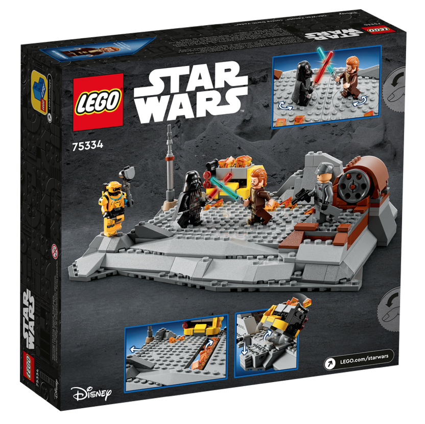 75334 Obi-Wan Kenobi contro Darth Vader include molteplici caratteristiche di gioco, come due piattaforme di battaglia rotanti per simulare duelli con la spada laser, una funzione di fuoco pop-up che divide il campo di battaglia, un supporto trasparente per salti della Forza e un carrello da miniera che può essere ribaltato.
