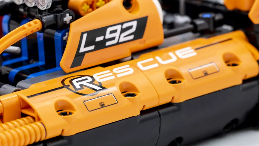 Con lo scafo inferiore completo, l'ultima fase da assemblare è la carrozzeria superiore, con una serie di sottoassiemi necessari per completare il guscio. L'uso di pannelli Technic e pezzi di tubo flessibile conferisce all'imbarcazione un aspetto autentico. Questi elementi sono di un sorprendente arancione, che non solo è accurato per un veicolo di soccorso in mare, ma si integra molto bene con il nero sottostante. Ulteriori dettagli vengono aggiunti attraverso l'uso di adesivi. Insolitamente per un set Technic non ci sono molti adesivi da applicare. Il numero dell'imbarcazione, un'unità di controllo e le decalcomanie di "salvataggio" sono tutto ciò che serve per decorare il modello finale. Gli adesivi aggiungono molto all'aspetto finale, ma richiedono un po' di concentrazione per allinearsi correttamente.
