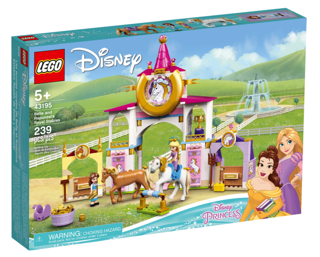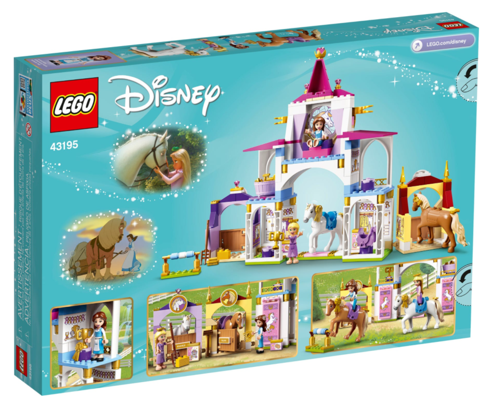 43195 Scuderie reali di Belle e Rapunzel comprende 239 pezzi e due mini-doll, oltre a due cavalli per stare alla scuderia. Un design in vetro colorato si trova nella parte superiore dell'edificio, con un ferro di cavallo dorato avvolto attorno ad esso.