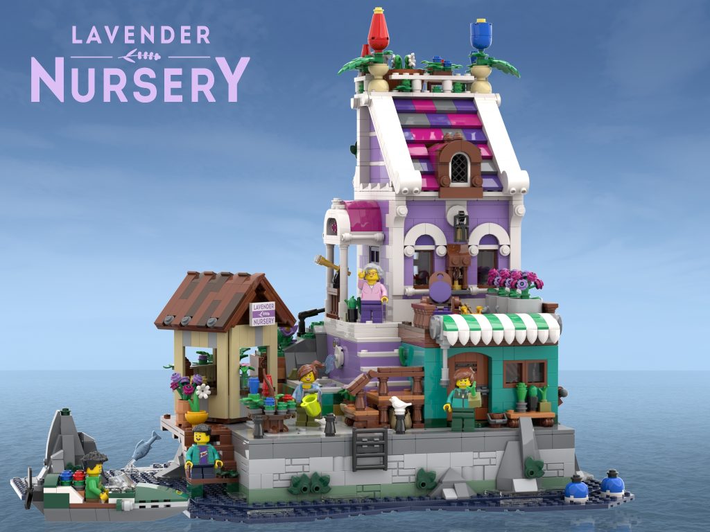 Lavender Nursery di Feacebricks è una creazione meravigliosamente costiera con una serie colorata di edifici circondati dall'acqua. È una scena autonoma adatta per qualsiasi collezione, ma anche le città modulari con una costa potrebbero essere in grado di incorporarla facilmente tramite un'ulteriore passerella in cemento.