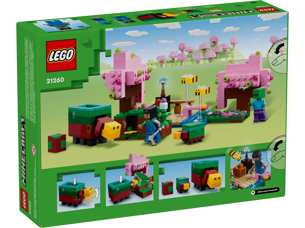 Uno degli ultimi biomi di Minecraft ottiene una certa rappresentazione LEGO in 21260 Il giardino dei ciliegi in fiore, un modello colorato che comprende due alberi rosa, terreno, fiori, api, annusatori e due minifigure.