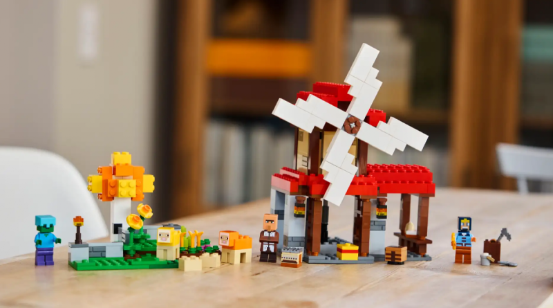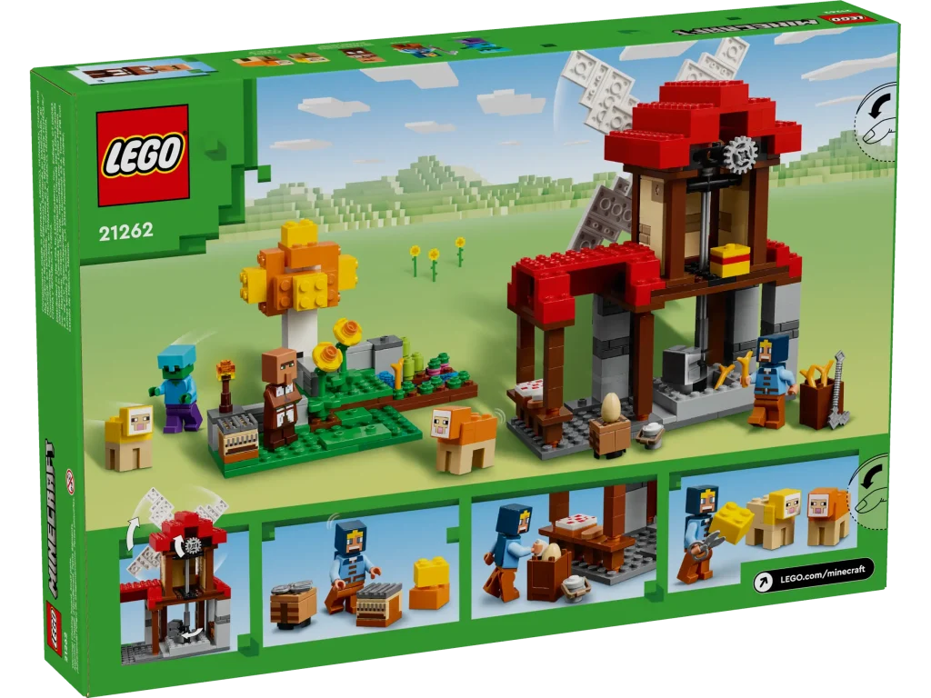 Un set LEGO Minecraft leggermente più grande, 21262 La fattoria del mulino a vento pesa 462 pezzi e include un mulino a vento funzionante (azionato manualmente utilizzando un ingranaggio sul retro della fattoria) insieme a tre minifigure, due pecore, un telaio in mattoncini, un campo con grano, canna da zucchero e barbabietola rossa, un albero e tanti accessori agricoli.