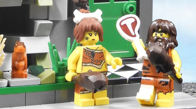 Adoro tutto di queste minifigure, e queste versioni provengono da 5004936 Iconic Cave, un set promozionale del 2017. I design stampati su queste minifigure sono squisiti e sono esaltati dai fantastici pezzi di capelli. Le mazze abbinate sono una grande aggiunta, e per questa build ho aggiunto una parte di bistecca rossa T-bone come tocco finale, uno dei miei accessori per minifigure preferiti.